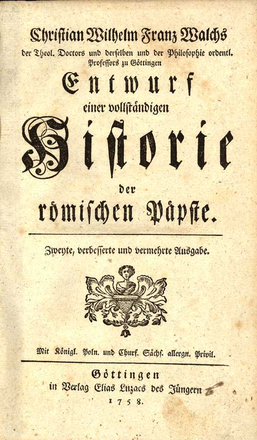 WALCH Christian Wilhelm Franz → Walchs - Entwurf einer vollständigen Historie der römischen Päpste → 180 CHF Göttingen : Luzac (Elias Luzacs d. Jüngern), 1758. 451 Seite. En très bon état. Reliure simple et foncionnelle. Pour les détails de l'édition, voir photos ci-contre.